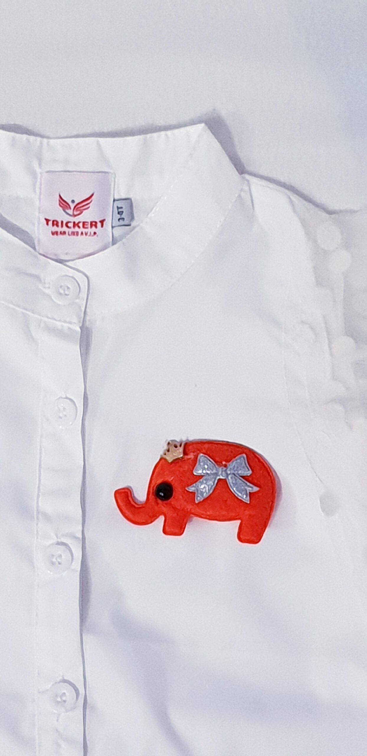 Compleu chic, pentru fete in trend cu moda, compus din bluza alba si pantalon rosu scurt, cu brosa elefant detasabila.
