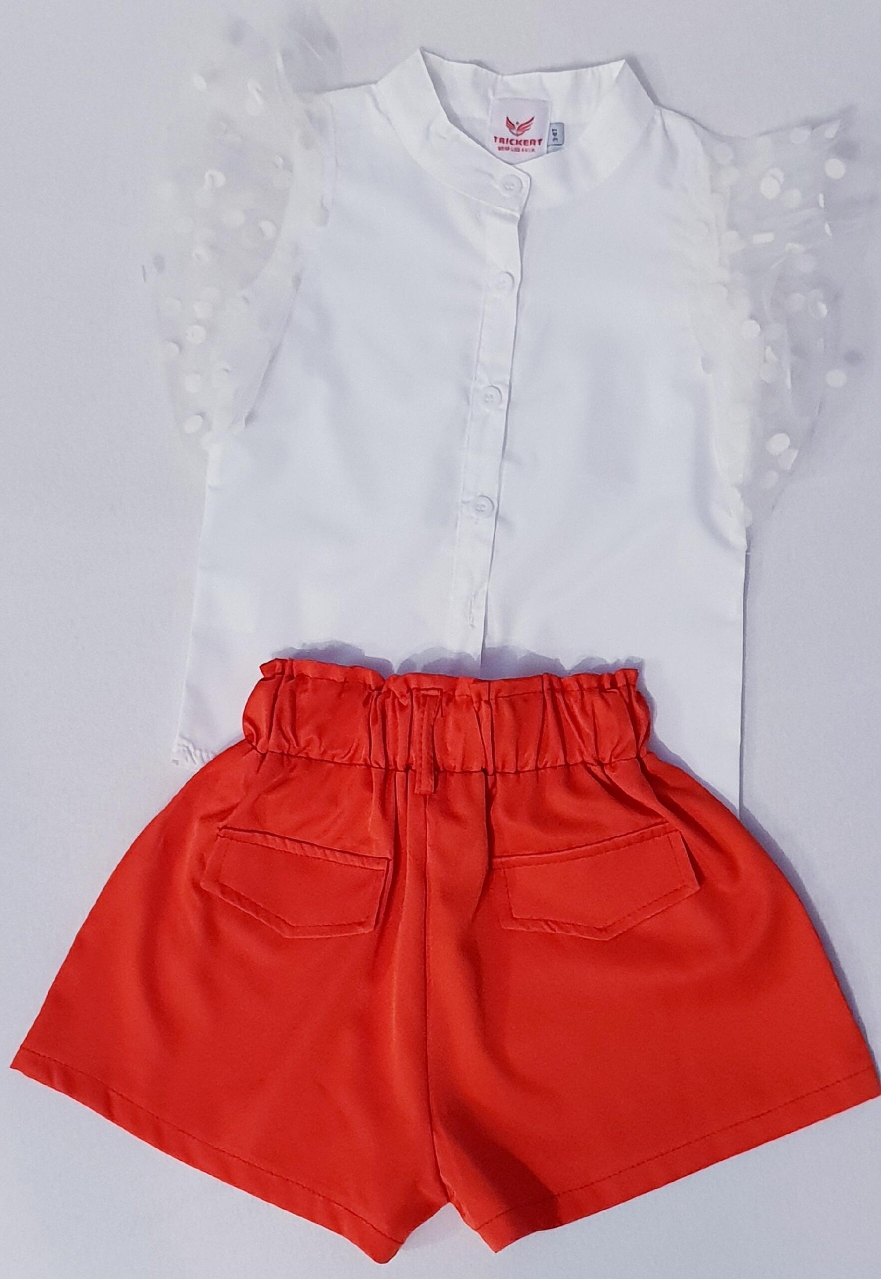 Compleu fete – bluza alba cu maneca din voal si pantalon scurt rosu, 5 – 6 ani