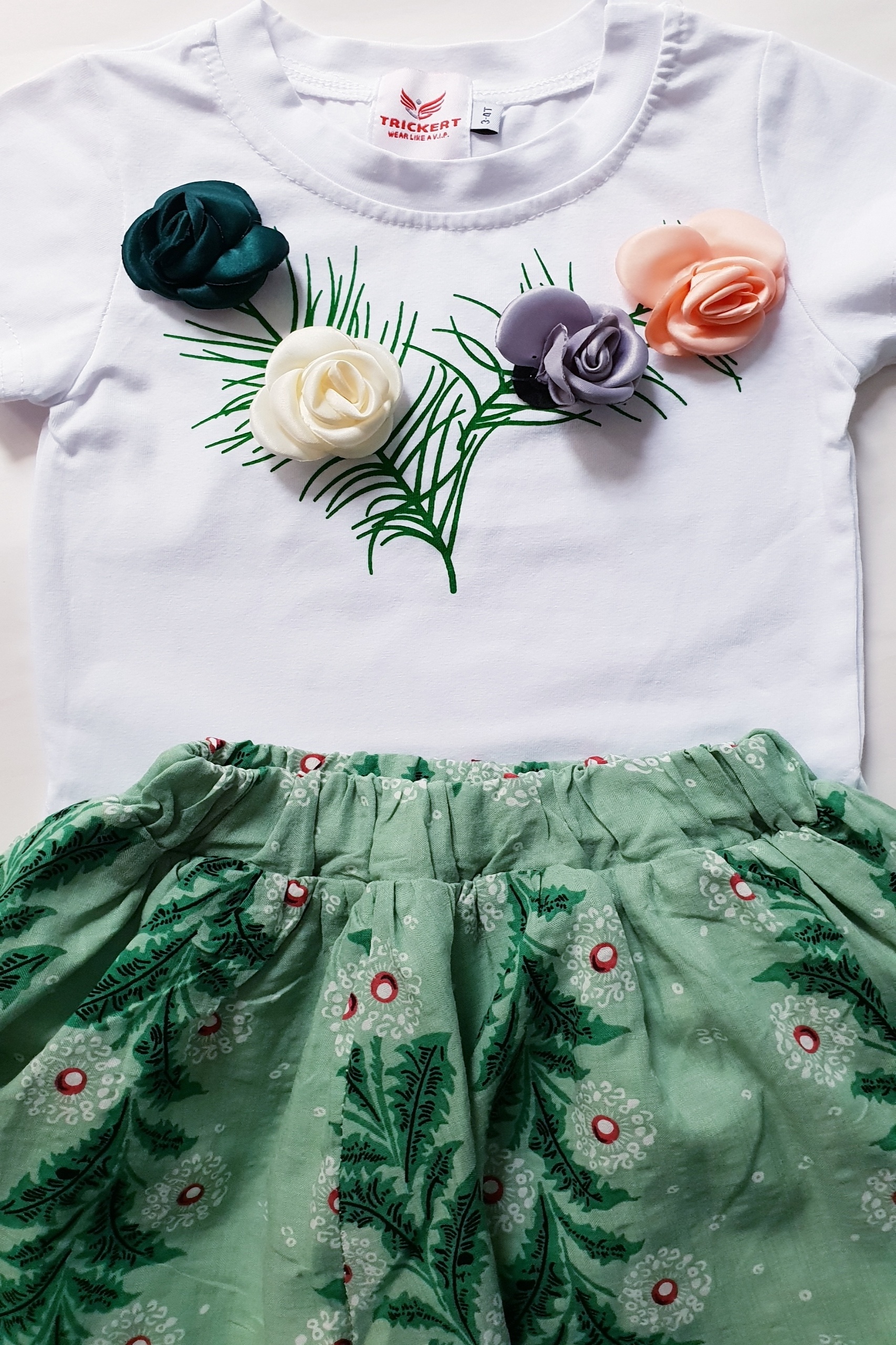 Compleul pentru fete este compus din tricou cu aplicatii de trandafiri si fusta lejera de vara!